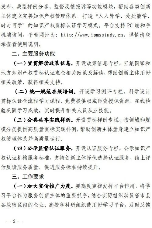 平台开设了系统化的知识产权贯标认证在线学习课程,以及学习后的在线测评、考试审核、在线监督等功能,进一步提升创新主体的知识产权管理能力和水平。在线课程会持续更新,高等学校、科研组织的学习课程也将陆续上线。